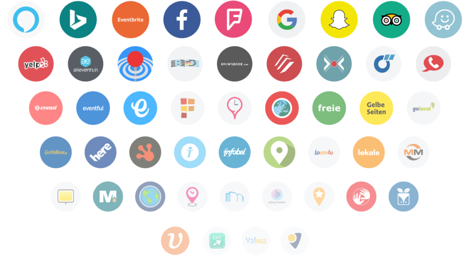 Google. Google Maps. Amazon Alexa. Apple Maps. Facebook. Bing. Yahoo. Yelp. Es ist egal, welche Karten, Apps, Sprachassistenten, Suchmaschinen, GPS-Systeme und sozialen Netzwerke Verbraucher benutzen, um Informationen über Ihr Unternehmen zu finden und mit diesem zu interagieren. Wichtig ist nur, dass sie auf allen Plattformen fehlerfreie, vollständige und ansprechende Informationen zu Ihrem Unternehmen finden.